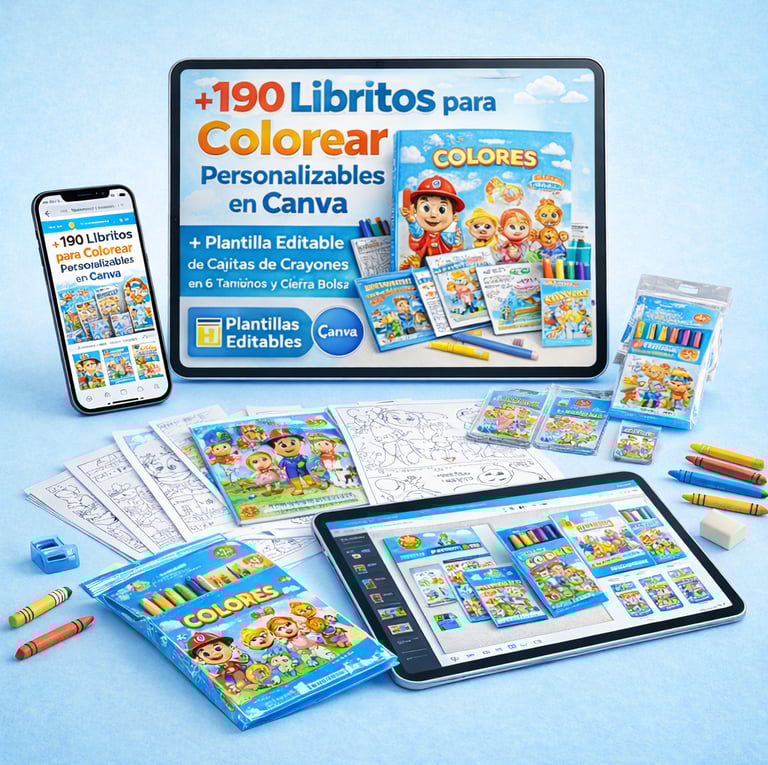 +190 libritos para colorear personalizables en Canva + plantilla editable de la cajita de crayones en 6 tamaños diferentes y cierra bolsa editable.